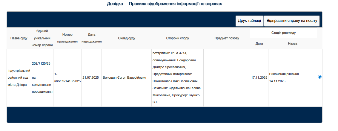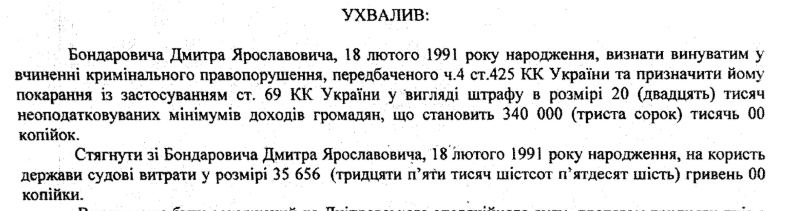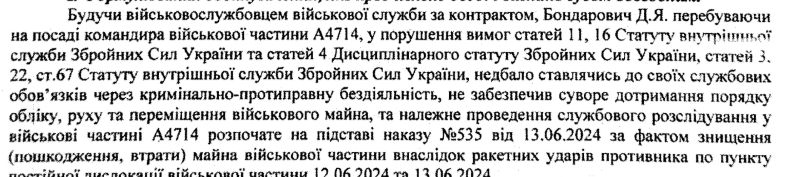 Судова справа 202/7125/25, однак, матеріали справи недоступні в реєстрі. Суд визнав Бондаровича винним за ч4. ст.425 Кримінального Кодексу України: Недбале ставлення до військової служби. Таке правопорушення карається позбавленням волі на строк від 5 до 8 років. Однак, суд тільки оштрафував Бондаровича на 340 тис. грн. Ймовірно, м’якіший вирок склали через підкуп прокуратури.