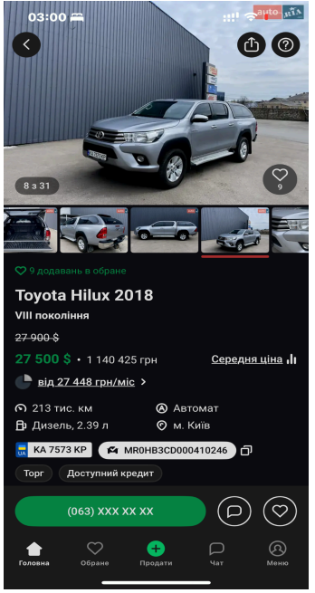 - Оголошення №38153544: продам Тойота Хайлюкс 2018 (KA7573KP) дизель 2.4 пікап бу у Києві, ціна 27500 $ VIN: MR0HB3CD000410246. Контактною особою нібито є та сама особа – Дмитро Гладченко +380 63 684 61 85. Власником є фізична особа Гладченко Анастасія Олегівна, 07.05.1993 р.н., колишня дружина Олександра Гладченка, з якою вони розлучились у 2025 році.